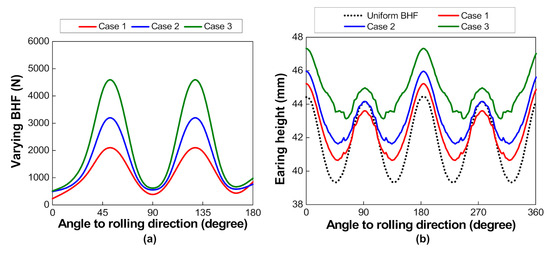Results of (a) BHF variation and (b) earing height profiles of AA1050-O by using three cases of varying BHF with α, β, γ selected from the full factorial design: Case 1 (α = 1500, β = −650, γ = 820); Case 2 (α = 2900, β = −250, γ = 720); Case 3 (α = 4300, β = −450, γ = 920).