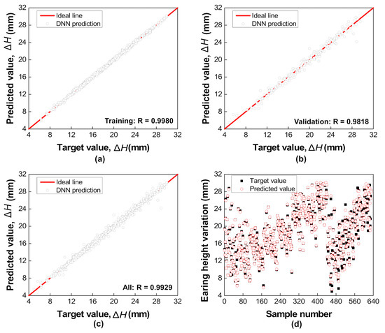 DNN model prediction with coefficient of determinations for (a) training, (b) validation, (c) all, and (d) compared results between the target and predicted earing height variation.