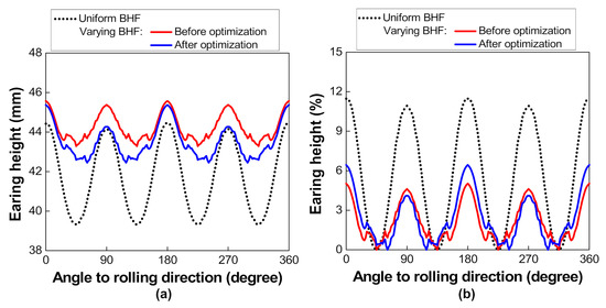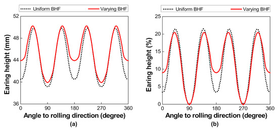 Figure 3 shows the variation of the BHF corresponding to the variation of earing height. The principle of varying BHF is to reduce the BHF in regions where earing occurs and increase the BHF in the valley regions. For a better understanding, as shown in Figure 3, it can be observed that the earing was formed at 45° and 135° to the RD. Hence, the applied BHF in these regions should be relatively smaller than those at 0° and 90° to the RD. According to the study by Yoon et al. [36], the analytical formula for the prediction of earing can be successfully derived by considering both the r-value and yield stress directionalities simultaneously, as follows: