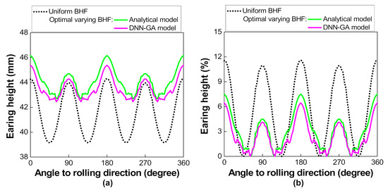 In addition, Figure 15b shows the relative earing height in comparison between the analytical and DNN-GA models. It can be observed that the percentage of earing height above the minimum cup height by using two optimal results was not much different apparently. However, it revealed a remarkable decrease compared to the uniform BHF. The result implies that the varying BHF, which can be optimized by both the analytical and integrated DNN-GA models, using the segmental blank holder is more reasonable for the reduction of earing formation than the uniform BHF using the conventional blank holder in the deep drawing process.