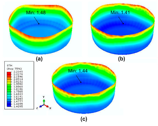where tinitial is the initial thickness of the blank sheet (tinitial = 1.6 mm), and tmin is the minimum thickness of the deep-drawn cup (tmin = 1.48 mm, 1.41 mm, and 1.44 mm for using the uniform and two optimal varying BHFs, respectively). By substituting these values into Equation (11), the maximum thinning rates were obtained as 0.08, 0.12, and 0.10, respectively. Generally, the maximum thinning rate cannot exceed the critical thinning rate of the sheet material, which was taken as 0.25, according to prior experience [12]. The result revealed that the maximum thinning rates by using the uniform and optimal varying BHFs were much lower than the critical thinning rate. This implies that there would be no occurrence of tearing in the deep-drawn cup by using the varying BHF.