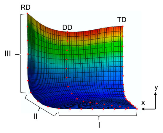 Schematic of thickness measurement along the rolling direction (RD), diagonal direction (DD), and transverse direction (TD) at three different regions: (I) cup bottom, (II) cup corner, and (III) cup wall for AA1050-O.