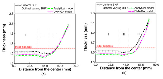 In order to further observe the thickness variation, the thickness of the deep-drawn cup was estimated along the RD, DD, and TD at three different regions of the cup: (I) cup bottom, (II) cup corner, and (III) cup wall, as shown in Figure 17. Note that the reference point is taken from the center of the cup bottom. Figure 18 shows the thickness variations of the deep-drawn cup along the RD, DD, and TD using the uniform and two optimal varying BHFs. The results show a non-uniform thickness distribution at different regions of the deep-drawn cup due to the different strain states [42]. At the top of the cup wall region, the thickness distribution in the RD, DD, and TD by using the uniform and optimal varying BHFs was higher than the initial thickness (tinitial = 1.6 mm). This is due to the radial tensile and circumferential compressive stress states in the flange region. According to the previous reports [42,43], the compressive stress along the circumferential direction can contribute to the increase in the thickness of the blank sheet. A decreased thickness was observed at the cup bottom due to the experiences of the biaxial tensile stress state and the friction between the punch and the blank sheet. Meanwhile, the maximum thinning of the deep-drawn cup was found at the cup corner region due to the plane strain condition; however, it was very negligible. In the comparison between the results of using the analytical and DNN-GA models, the thickness in different directions revealed a similar variation. Additionally, it showed a slight decrease in thickness compared to the uniform BHF due to the increase in the deep-drawn cup height [44]. The interesting point is the increase in thickness in the case of using the optimal varying BHF observed at the cup wall region in the TD. This is due to the decrease in varying BHF toward the end of the deep drawing process, leading to the lower tensile stress in the wall region of the blank sheet. Overall, the difference in thickness of the deep-drawn cup between the uniform and varying BHFs was insignificant. It can be concluded that the varying BHF is an effective method to minimize earing formation in deep drawing with little influence on the thickness variation in the deep-drawn cup. Although the blank holding force of a segmental holder was held constant in the present study, the time dependence of the BHF seems to be important for further study.