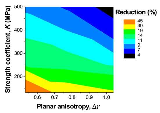 where ΔH′ and ΔH are the earing height variations calculated using the varying and uniform BHFs, respectively. It can be observed that a material with a greater combination of K and Δr showed less influence on the reduction of earing height variation. As shown in Figure 20, the reduction of earing height variation monotonically increased with the decrease of the K and Δr simultaneously. This result demonstrates that the lower the material strength, the greater the effect on the reduction of earing formation in deep drawing by using the varying BHF that can be obtained.
