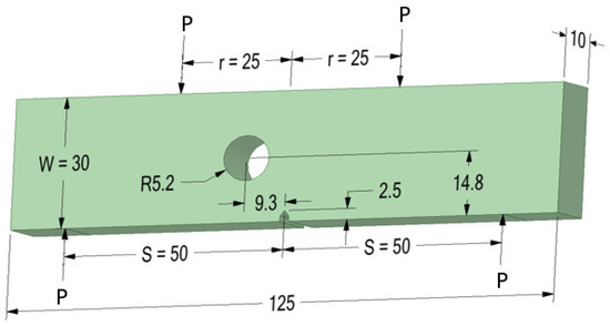 This case corresponds to a single cracked beam with a hole, loaded in the upper two points and constrained in the lower two points, i.e., a modified four-point bending specimen as shown in Figure 1. This refers to a problem of plane strain that was solved numerically in [23,24]. The geometry is 125 × 30 × 10 mm3 in size, and the hole radius, R = 5.2 mm, was located 9.3 mm from the left of the original crack and 14.8 mm above it. This specimen was simulated under fatigue loading with a constant amplitude load ratio, R= 0.1, and the quantity of the applied loads were P = 100 N. The initial mesh of this geometry is shown in Figure 2. The material for this specimen was cold-rolled SAE 1020 steel with the following properties as shown in Table 1: