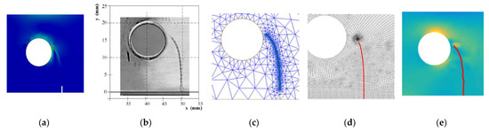 The predicted crack growth trajectory was smooth and identical to the experimental path predicted by [23] and can be further compared to the predicted trajectories obtained using other numerical methods, such as the finite element method based on local Lepp–Delaunay mesh refinement used in [24], the finite element with configurational forces used in [25], and the coupled extended meshfree–smoothed meshfree method used in [26], as shown in Figure 3a–e, respectively. In the initial period, the crack grew with a small increment when the crack tip was relatively far from the hole. The crack growth direction changed with a large angle and gradually affected the hole with the crack proceeding. Figure 4 illustrates six different steps of the crack growth represented in the von Mises stress distribution, whereas the three-dimensional distribution of the von Mises stress distribution with and without deformation is shown with a legend in Figure 5.