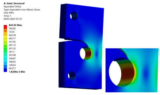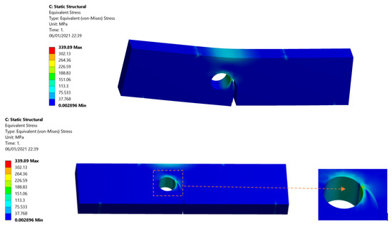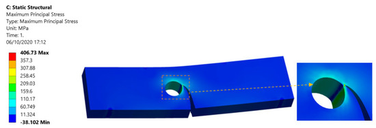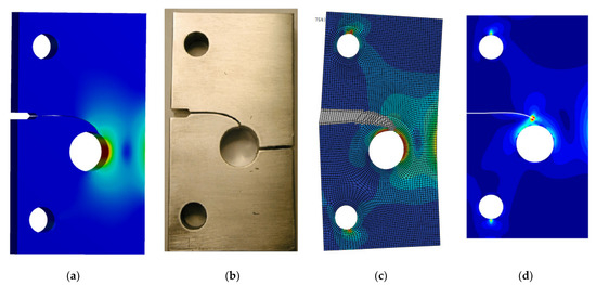 The crack path growth simulated with ANSYS software was compared, and had strong agreement, with both experimental and numerical results from ABAQUS software obtained by [28] as well as with numerical results performed by [29] using XFEM with a controllable crack propagation strategy, as seen in Figure 11a–d, respectively. The distribution of the maximum principal stress, the von Mises stress, and the equivalent strain are shown in Figure 12, Figure 13 and Figure 14, respectively.