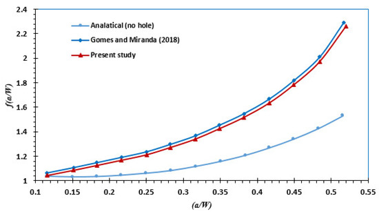A generalized linear regression method facilitates usage of the formula, which displays SIFs as a function of both the relevant crack and contact parameters, easing assessment of crack growth behavior. For the modified four-point beam specimen used in the above analysis, the numerical dimensionless SIFs were compared with the analytical solution in Equation (11) for the standard beam without a hole, as well as with the dimensionless SIF values calculated by [14] applying the boundary element method (BEM) with BemCracker2D (BC2D) software as shown in Figure 7.