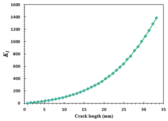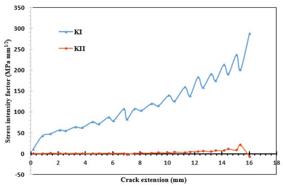 The predicted values of the two modes of stress intensity factors, i.e., KI and KII, are shown in Figure 15 and Figure 16, respectively. As shown in Figure 14, the crack starts to grow in a straight direction, indicating the domination of KI followed by a curved direction with an increasing negative value of the second mode, KII, that results in the crack growing toward the hole.