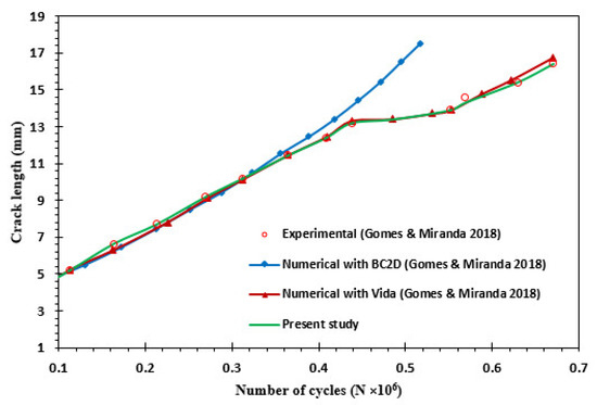 The predicted values of both modes of stress intensity factors, i.e., KI and KII are shown below in Figure 8. As seen in this figure, the crack started to grow in a straight line as the first mode of stress intensity factors dominated the crack growth direction. When the crack direction was influenced by the presence of the hole, the crack grew toward the hole and changed its direction, increasing the values of the second mode of stress intensity factors. The predicted fatigue life according to the number of cycles was compared, as shown in Figure 9, to the experimental results performed by [14] alongside the numerical results for the same authors with two software programs: Vida and BemCracker2D. According to this figure, there was a strong correlation between the present study’s result and the Vida software compared to that of the BemCracker2D. According to Figure 8, the bimodality ratio (KII/KI) was not zero. The direction of the crack was dominated by KI at the beginning of the crack growth since the KII values were small compared to the KI values. After that, as the second mode of stress intensity factors, KII was increased gradually up to a maximum value of 21 MPa(mm)1/2, leading to a change in the direction of the crack toward the hole.