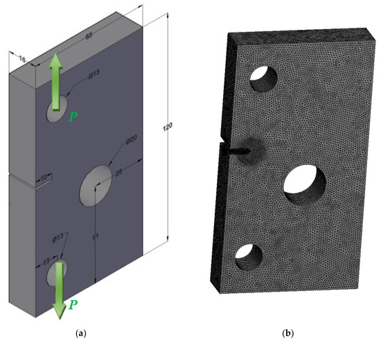 Consider a 120 mm × 65 mm × 16 mm rectangular plate with two 13 mm diameter holes near both ends and a 20 mm hole near the middle of the plate, as seen in Figure 10. At the middle of the plate is an initial edge crack of 10 mm. The plate was made from aluminum 7075-T6, with the material properties shown in Table 2, and the amount of the fatigue load was P = 20 kN with a stress ratio R = 0.1. Linear elastic material behavior was assumed. The initial XFEM ANSYS model with an eight-node tetrahedron mesh is shown in Figure 10b. The size of the mesh element was set as 1 mm, creating a mesh of 581,980 nodes and 398,566 elements.