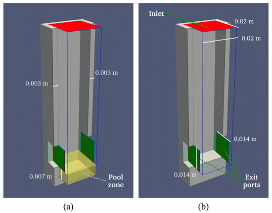 Figure 1 sketches the geometric features of the two nozzles studied in this work. The NIP is a box-type nozzle whose internal bore has a square cross-section that remains constant throughout its entire length. The NIP has two square-shaped outlet ports whose length is minimal. This figure also outlines the internal structure of each NIP through blue lines, and gray-filled surfaces depict the walls of their corresponding physical model. The shape of the nozzles’ bottom wall is flat. The sum of areas of the exit ports is equal to the nozzle bore area. The bottom well depth is half the height of the exit ports for a type A NIP. In this figure, the NIP exit ports, inlet, and pool zone are colored, respectively, in green, red, and yellow. This figure also includes the NIP dimensions.