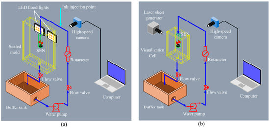 Schematic representation on the two experimental configurations studied in this work: (a) NIP operating inside a scaled mold model and (b) NIP operating inside a visualization cell.