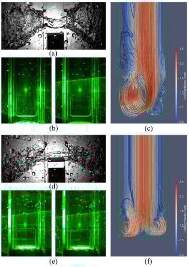 Hydrodynamic behavior inside the nozzle: (a,b) Physical simulations of type A NIP; (c) Numerical simulations of type A NIP; (d,e) Physical simulations of type B NIP; and (f) Numerical simulations of type B NIP.