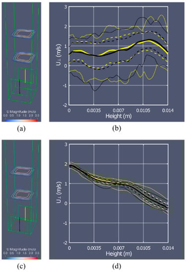 Figure 4a,c also shows two trajectories (black line and yellow line) along which statistical analysis of the liquid velocity at the outlet ports was made. The analysis results are reported in Figure 4b for type A NIP and in Figure 4d for type B NIP.