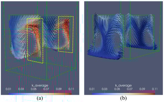 As it was shown above, vortices modify the outflow structure and determine the jet’s shape. Since our numerical models do not explicitly simulate the jets we compute their features indirectly. In order to quantify the flow structure near the exit ports we calculated the time-averaged velocity components and turbulent kinetic energy for each mesh element along two planes. These planes are placed 0.500 mm from the exits toward the interior of the NIP. The averaging was done using Equation (4), where the time instances considered in two seconds were m = 40.