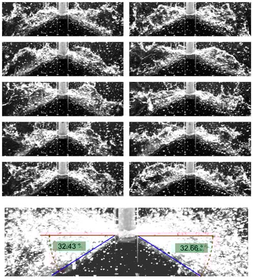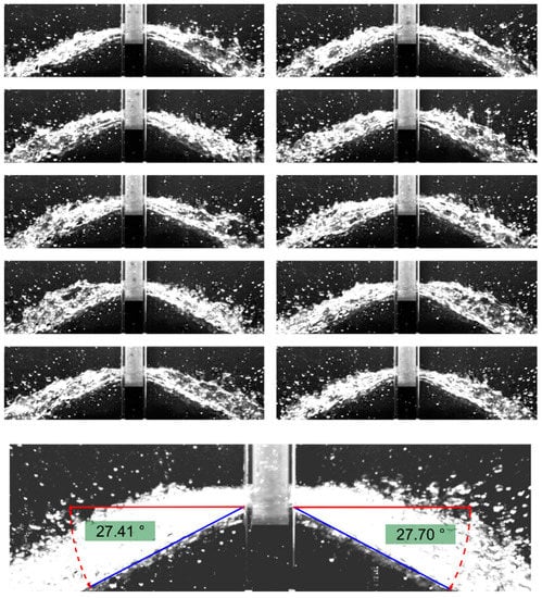 The top panels show photographs of water jets discharged (ejected) from the type B NIP taken at 0.5 s intervals. The bottom panel shows the superposition of the ten photographs above it and also shows the angles formed between the jets inferior contour (blue) and the line perpendicular to the ports (red).