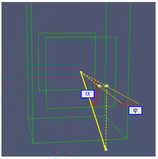 In order to find the correspondence between the velocity field inside the NIP and jets’ aperture angles measured in the experiments, we calculated weighted average velocity components over the same plane used for time averaging in Equation (4). In addition, we calculated the average turbulent kinetic energy that characterizes the outflow turbulence [,]. The weighted average is performed over all elements with surfaces dS on the plane S as given by Equation (5).