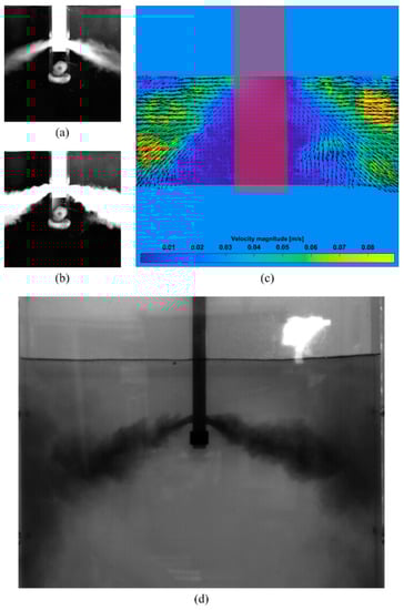Figure 9a,b has two representative samples of the processed images, whereas Figure 9c shows the estimated velocity vector field. The submergence depth is defined as the distance measured from the outlet port bottom edge to the water surface level. The submergence depth in this experiment was 0.07 m. The fluid flow pattern and the liquid velocity magnitudes shown in Figure 9c agree with the expected behavior. The submergence depth for the test presented in Figure 9d was increased to 0.11 m. The combination of black ink and a white screen was used because it improves the visualization of the jets’ features and the zones where jets hit the mold’s narrow walls. Figure 9b,c show that jets produced by type A NIP are not symmetric. Likewise, these figures confirm that the jets’ amplitude decreases when the NIP discharges into the water instead of discharging into the atmosphere.