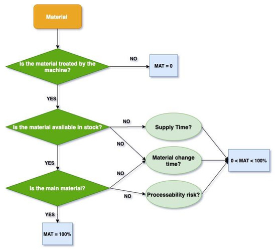 To formulate each one of the KPIs, the research team has tried to take into consideration all the aspects that are evaluated by the specialists during the process design phase for a specific product. These aspects have been correlated with each other in specific flow diagrams and then translated into analytical expressions, which are appropriately calibrated according to a series of experimental results. Figure 2 shows, as an example, the flow chart of the MAT KPI.