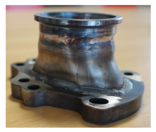 - Automotive manifold (Figure 4): The use case representative of the possible industrial application for the spare part is a manifold that is used in the automotive sector for the discharge of exhausted gas. The product is currently made by welding three different components: a flat base suitably drilled, a truncated cone of connection, and a final neck on which the exhaust pipe is inserted. The welds are clearly visible in the image shown in Figure 4. The material is 316L stainless steel, which is able to withstand the high temperatures of the gas generated by combustion.