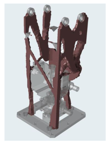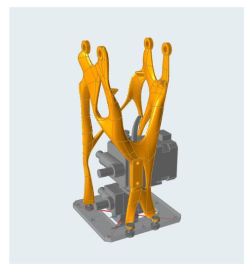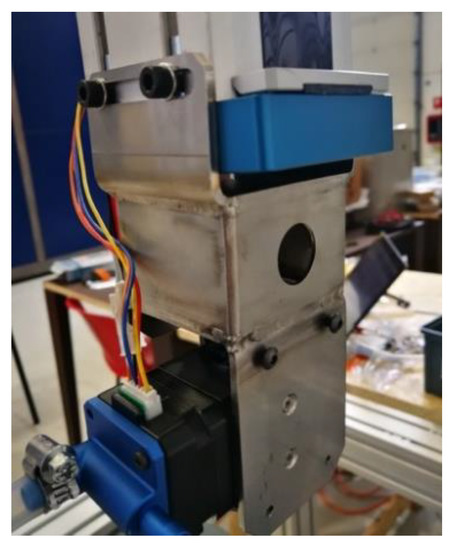 - Fused Deposition Modeling (FDM) head (Figure 5): The use case identified to represent the classes of components indicated as “new product” and “small series” is an assembly of metal parts welded together, which was designed by the research group to connect an FDM nozzle to the Z-axis of a Cartesian machine carried out within another research project. The prototype works in two different configurations:
