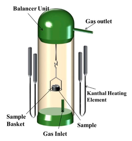 The sample was charged into a thermogravimetric analyzer (TGA, SETSYS Evolution, Setaram, Caluire-et-Cuire, France), as shown in Figure 2, and then heated to a target temperature in a high-purity Ar (99.999%) atmosphere. When the target temperature was achieved, the Ar gas was replaced with CO gas (99.99%), and the weight changes were measured every second using TGA. The reduction was carried out in the temperature range of 1073–1273 K. Based on the experimental data obtained through TGA, the reduction rate (R) can be defined as follows:
