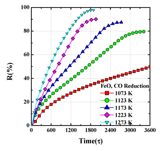 Reduction behaviors of FeO at various temperatures in the range of 1073–1273 K (time τ: reset the time when reduction starts).