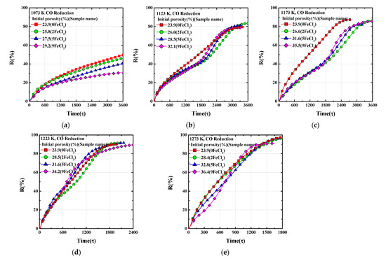 Figure 4 shows reduction behaviors of FeO with various porosities in the temperature range of 1073–1273 K. Despite the increase in overall porosity by introducing extrinsic pores, the initial reduction rate abnormally tends to decrease. The overall porosity and initial reduction rate followed an inverse relationship, and the trend shows an inflection point at which the reduction rate increases after approximately 40% of the degree of the reduction process. The tendency to increase the reduction rate after 40% reduction degree increased with the extrinsic pores. In addition, this abnormal behavior related to pores gradually decreased with increasing temperature. Bahgat [19] and Kim [20] reported that the initial porosity and reduction rate are proportional to each other. The positive effect of porosity on reduction rate is generally accepted. However, the results of this experiment show a behavior contrary to the general view of porosity and reduction rate.