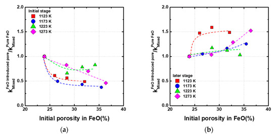 Ratios of apparent reduction rate constants of extrinsic pore introduced FeO and pure FeO for each initial overall porosity in FeO. (a) Initial stage, (b) Later stage