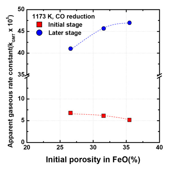 The dimensionless kinetic parameter, kLater stage/kInitial stage, is shown in Figure 6, where kLater stage and kInitial stage represent the apparent rate constants in the initial and later stages, respectively. The rate constants of gaseous mass transport through the product layer against the interfacial chemical reaction significantly increased after half of the reduction is complete, compared to those observed for the initial reduction; further, the gaseous mass transport rate constants increased by 2–7 times after the later stage reduction. The abnormal reduction behavior is more affected by the diffusion of gas than by the chemical reaction. In addition, at 1173 K, where abnormal behavior is well confirmed, Figure 7 shows the apparent gaseous rate constant at the initial and later stages. In the initial stage of reduction, although the initial overall porosity in FeO increases, the apparent gaseous rate constant tends to decrease. However, in the later reduction stage, the apparent gaseous rate constant tends to increase in proportion to the initial overall porosity. It is believed that the diffusion behavior of the reducing gas changes because of the change in the morphology of FeO during the reduction process.