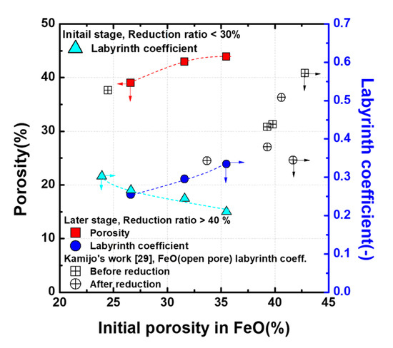 where is the labyrinth coefficient, is the porosity of the FeO pellet, K is the equilibrium constant, and are the diffusion coefficients of CO and CO2 in the pore. In addition, DS is an effective diffusion coefficient that can be calculated by Ishida-Wen’s model [28]. A labyrinth coefficient value indicates the gas permeability in the FeO pellet. Applying this experimental data to Equation (5), it is shown in Figure 8 as a function of the initial porosity in FeO. The initial reduction stage of porosity in FeO increases, and the labyrinth coefficient tends to decrease. This means that the extrinsic pores mainly generated in FeO by the evaporation of FeCl2 are closed or open only at one end, which have a negative effect on reduction. Therefore, despite the increase in the overall pores, the initial reduction rate decreases because the formed pores are not suitable for reduction. However, as the reduction proceeds, the porosity in FeO increases and the labyrinth coefficient also tends to increase. During the reduction process, the structure of morphology changed in favor of gas diffusion, thereby increasing the labyrinth coefficient. These results are in good agreement with Kamijo’s [29] research. Accordingly, it is thought that reduction behavior exhibits an abnormal behavior that accelerates the reduction rate after half of the reduction process is complete.