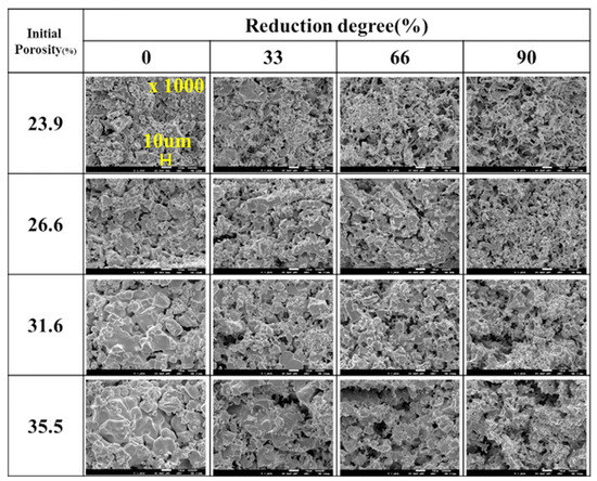 According to Rouquerol et al. [23], pores are classified into closed pores and open pores based their accessibility by to an external fluid. In detail, open pores are again divided into open only at one end (dead-end or saccafe) and open at two ends (through pores). Among them, closed pores and open only at one end (dead-end) adversely affect reduction because the gas flow is not smooth. Meanwhile, the pores that are open at two ends (through pores) help in the reduction process due to the permeability of the gas. The results of previous studies indicated the necessary for discussion of such pore quality.