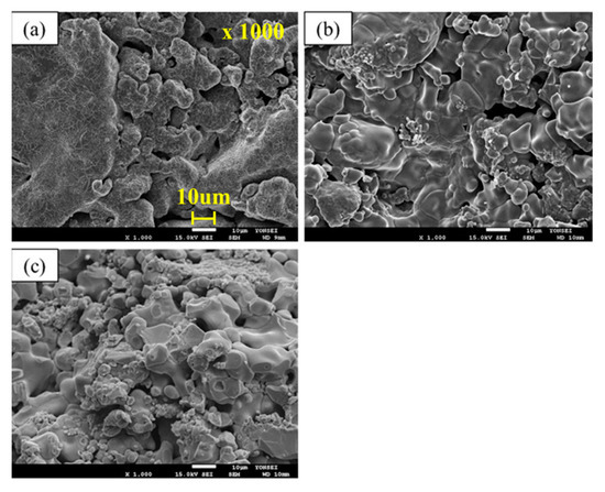 SEM micrographs of the FeO sample at different temperatures, obtained using 9FeCl2 sample under the condition of the inert gas; (a) 1073 K, (b) 1173 K, and (c) 1273 K.