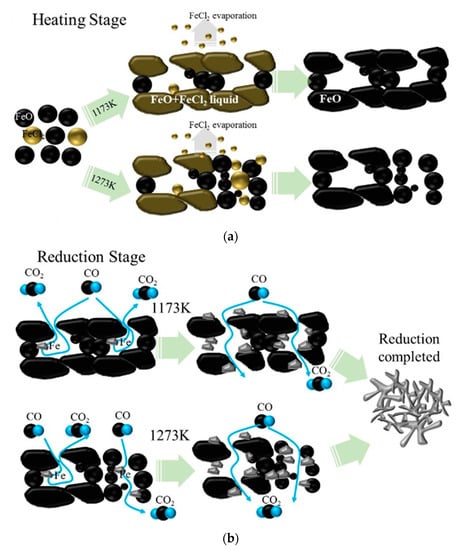 Schematic for conceptual morphological evolution of FeO-FeCl2; (a) heating stage and (b) reduction stage.