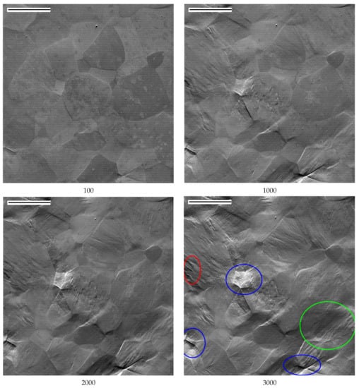 The pictures of Figure 3 show the roughness evolution after 100, 1000, 2000, and 3000 cycles. The roughness gradually increases, with a stronger effect close to grain boundaries. Grains encircled in blue, for instance, are subjected to the progressive formation of a step along grain boundaries. This can induce some stress concentration or notch effect, and lead to microstrucural ratcheting, as discussed later []. The images also show numerous curved slip lines associated with the easy cross slip characteristic of BCC materials []. Such sinuous or wavy slip lines are also referred to as pencil glide [].