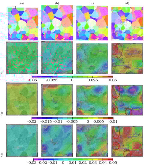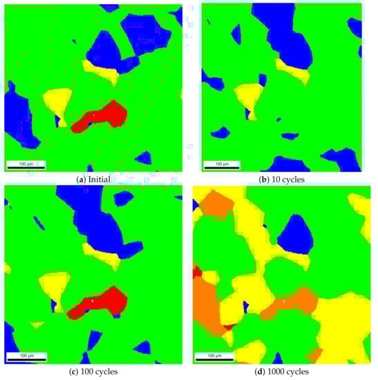 Local residual strain evolution during a fatigue test at and s: (a) After 100 cycles, (b) 1000 cycles, (c) 2000 cycles, and (d) 3000 cycles. Loading direction is horizontal (direction 2). The picture size is 400 × 400 m.
