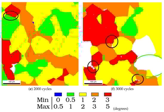 For the component after 3000 cycles, the distribution becomes highly scattered around a mean strain close to 3%. The zones of maximum strain correspond to areas including sliding grain boundaries (see the red circles in Figure 4 and blue circles in Figure 3). Clear evidence of grain boundary sliding (GBS) can be seen in Figure 3 after 1000 and 2000 cycles in the form of an inclined white line in the lower right part of the pictures indicating out of plane sliding of one grain boundary.