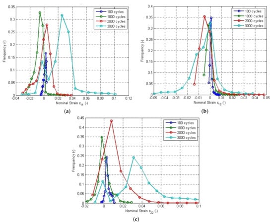 Histograms are provided for each strain components at 4 cycle numbers in Figure 6. The strain distributions correspond to the zone observed in Figure 4. A spreading of the strain distribution is observed for increasing cycle numbers. This illustrates quantitatively the strain heterogeneities discussed in the previous paragraphs. A significant part of the distribution is located at high values of surface strains, in spite of the low applied global amplitude. This corresponds to the visible roughening of the surface, a well-known effect in fatigue [,]. Significant errors in the measured strain values are expected due to the out of plane displacement component which limits the validity of the 2D correlation. This is especially the case after 3000 cycles where surface roughening is very pronounced. A remarkable feature of the and histograms is the shift toward larger mean values after 2000 and 3000 cycles. This indicates that considered region made of about 60 grains behaves as a whole differently from macroscopic straining conditions. This means that the representative volume element size for fatigue loading conditions must be larger than this observed zone. Maximal values for the and components are greater than 5% up to 11% after 3000 cycles. After 3000 cycles, the computed and strain values are strongly affected by errors induced by surface roughing. These high values are in agreement with the literature, where similar strains are calculated from experimental data [] in stainless steels. Similar maximal local strains have been calculated in the literature for different loading conditions from the present case [,,] in Nickel-based superalloys.