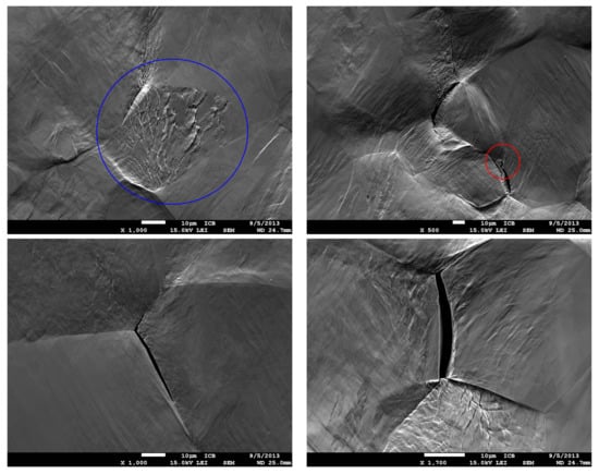 Crack initiation is observed mainly at grain boundaries, thus indicating an intergranular cracking mechanism. Intergranular crack branching is observed at triple junctions in Figure 7. Transgranular cracking is also observed as a competing mechanism, see the red circle in Figure 7. Severe extrusion–intrusion zones are visible in the blue circle of the same figure. They are associated with numerous intense slip lines visible in some grains. Crack branching from a grain boundary to some PSB is found to take place in a grain circled in red in Figure 7. As the fatigue test has been interrupted after 5000 cycles, it is not known whether the final fracture is due to inter- or trans-granular cracks. In previous studies at CEA (unpublished), a combined intergranular–transgranular fracture has been reported [,]. After 5000 cycles, the minimum crack size observed is about ≈10 m and the maximal one is ≈120 m.