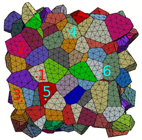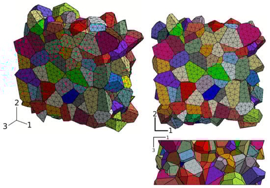 The detailed boundary conditions are described in []. They amount to prescribing the mean strain in the tension–compression direction 2 with vanishing mean stress components (except ). The two flat surfaces of the polycrystalline aggregate of Figure 8 are called and . The surface is subjected to the Dirichlet boundary condition where is the displacement component along the direction 3, see the coordinate frame in Figure 8. The remaining boundary conditions for this surface are vanishing traction components along 1 and 2. The surface is traction-free in all 3 directions, corresponding to a free surface, as in the experiment. The strain fields on this free surface will be analyzed and compared, in a statistical sense, with the experimental results.