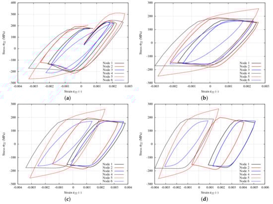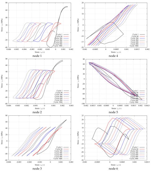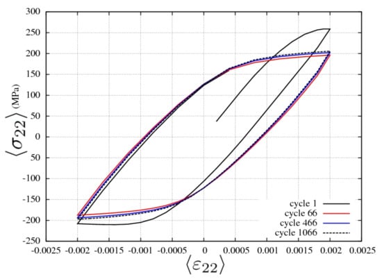 The overall stress–strain loops, i.e., the – curves, of the studied cyclic test on the considered polycrystalline aggregate are given in Figure 9 for various cycle numbers from the CPFEM simulation. The stress and strain amplitudes are clearly visible. The loops at 66, 466, and 1066 are almost identical showing that no macroscopic ratcheting takes place for the considered loading. The first loop is strongly different due to the initial peak stress associated with static strain aging discussed in [,]. Comparison between experimental initial and stabilized loops can be found in the latter reference. It is not reported here since the present work concentrates on cycle numbers from 100 to 5000.