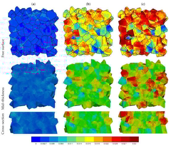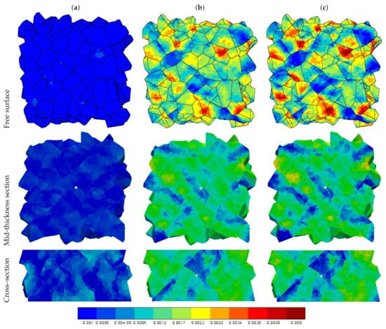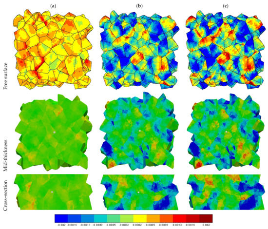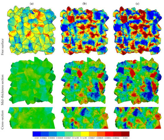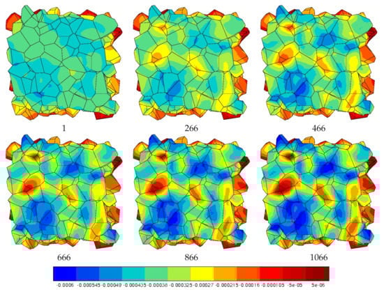 The fields of the strain components , and at the free surface of the polycrystalline aggregate are shown in Figure 10, Figure 11 and Figure 12, respectively. Three snapshots are presented at the cycle numbers 66, 666, and 1066 for each component. The residual strain field is strongly heterogeneous with values from −0.003 to more than 0.003, to be compared to the loading amplitude . The deformation structures extend over several grains as observed under monotonic conditions [,]. This heterogeneity is found to increase significantly between = 66 and = 666, with certain grains localizing more deformation, especially at some grain boundaries. The localization remains the same after 400 additional cycles but the contrast intensifies between tensile and compressive zones. The heterogeneity culminates for the shear component. Moreover, some areas close to grain boundaries and triple junctions display discontinuous strain values due to change in crystallographic orientation. This strain localization close to grain boundaries is shown to increase with the number of cycles. The dramatic development of strain heterogeneities under cyclic loading is in qualitative agreement with the experimental results. However, the local strain values predicted after 1000 cycles significantly underestimate the corresponding strain field measurements of Figure 4b. There are several reasons to explain such a discrepancy, which will be discussed later in this work.