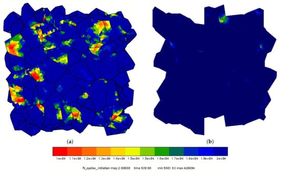 Improvements of the used crystal plasticity model are possible to include more sophisticated dislocation evolution equations for cyclic plasticity []. It must be acknowledged that the used modeling framework cannot account for grain boundary sliding (or cracking) or PSB formation. Validation of the presented fatigue crack initiation model is necessary for other loading conditions including non-vanishing mean stress loading and various loading ratios. The proposed fatigue crack initiation criterion could be combined with a more specific intergranular cracking model based on the alternating traction vector acting locally at grain boundaries. It is not sure that the consideration of a competition between transgranular and intergragranular crack initiation will give a better description of the experimental results as the proposed model predicts, in any case, crack initiation close to grain boundaries and triple junctions. More importantly, coupled fatigue damage–plasticity models could then be used to describe the local propagation of such initiated cracks. In that case, intergranular and transgranular cracks can be distinguished. Such a coupled crystal plasticity and damage model was proposed and applied to crack initiation and propagation in single crystal superalloys in []. This includes a gradient damage term which is necessary to obtain mesh-independent crack simulation results. Such a regularization was used in [,].