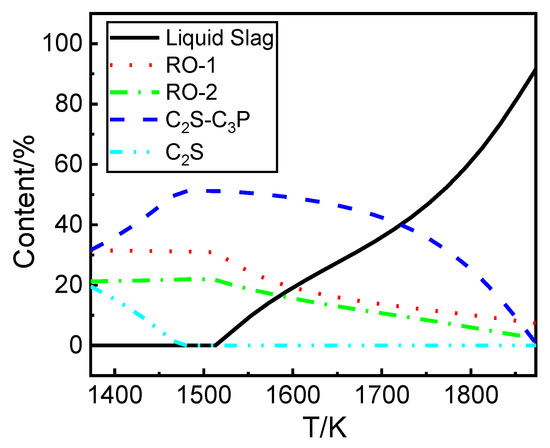 There are some studies on the micro-morphologies and main compositions in the different phases of dephosphorization slag at low temperature with low basicity [6,10,14,15,16,17,18,19,20,21]. It was reported that the phase of dephosphorization slag is mainly composed of Fe (iron)-rich phase including metal oxide and Ca3Fe2O5, P-rich phase including 2CaO·SiO2 (C2S), Ca3(PO4)2 (C3P) and nCa2SiO4–Ca3(PO4)2 (nC2S–C3P), and matrix phase [6]. Zhou et al. showed that there are mainly two kinds of P-rich phases with different phosphorus contents [10]. One is the low-phosphorus phase (6C2S-mC3P, m = 0.6294~1.3400) and the other is the high-phosphorus phase (C2S-nC3P, n = 1.1064~1.4303) in multiphase CaO-FeOt-SiO2-P2O5 (6%~13%) slags.