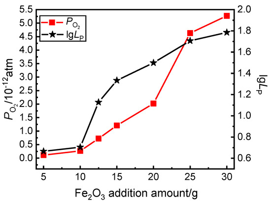The changes in the calculated as well as LP with the Fe2O3 addition amount at the end of dephosphorization are shown in Figure 11. It can be seen that the values of calculated as well as the measured LP values all increase with increasing the Fe2O3 addition amount. This is because with the increase of the Fe2O3 addition amount, the oxidation ability of phosphorus in the hot metal is enhanced, as shown in Figure 4. So, the measured LP values gradually increase with increasing the Fe2O3 addition amount. It can be found from Equation (6) that the higher is the distribution ratio, the greater is the calculated value of . Therefore, the values increase with increasing the Fe2O3 addition amount. It is found that when the oxygen potential at the interface is greater than 0.72 × 10−12, the dephosphorization ratio begins to increase sharply.