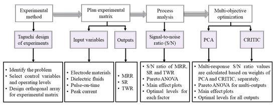 The present work aims to evaluate the EDM machining of HcHcr steel by performing analysis of process variables on performance characteristics (MRR, TWR, and SR). The Taguchi method and Pareto ANOVA were employed to determine the optimal levels for each of the studied responses. The practicality significance of peak current, electrode materials (graphite, copper, and brass), dielectric fluids (distilled water and kerosene), and pulse-on-time are tested on the performance characteristics. The utility concept was used to determine optimal levels for all responses. PCA and criteria importance through criteria inter-correlation (CRITIC) methods are utilized to estimate the weight factors necessary for multi-objective optimization. The optimal conditions were further analyzed using optical micrographs to study their surface characteristics. The proposed framework of the current research is shown in Figure 1.