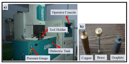 The electrical discharge machining (EDM) process has proven its effectiveness to generate complex profiles even for hard and brittle materials with fewer heat-affected zones and dimensional inaccuracies [11,12,13,14]. Performance characteristics (material removal rate (MRR), tool wear rate (TWR), and surface roughness (SR)) are influenced significantly by the variables, namely peak current, discharge energy, electrode material, dielectric fluid, plus on time, and other process parameters [15,16]. Machining AISI D2 steel with different electrode material and flushing pressure affects more on MRR and SR [17]. The Taguchi method identified that peak current directly influences electrode wear, whereas pulse duration affects the MRR [18]. Powdered metallurgy tool electrode is used to evaluate the process parameters of EDM process (such as MRR, SR, and TWR) of hast alloy with the change in current and voltage. Maximum MRR was observed at the mid-values of voltage, minimum TWR at low values of current, and minimum SR was observed at the mid-values of current and voltage [19]. EDM of AISI D2 steel is carried out under the influence of kerosene with different proportions of Cu-W electrode material, flushing pressure, current, and duty cycle on MRR and SR [20]. The electrode material was found to have the strongest effect on both the responses.