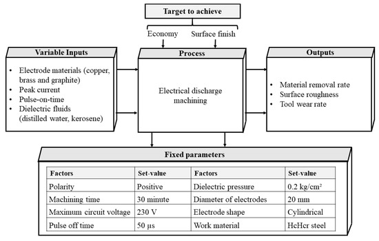 The input-output model of EDM is shown in Figure 3. Prior to experimentation, the work samples (20 mm × 30 mm × 5 mm) were ground to make them perfectly flat on both sides (top and bottom) to avoid dimensional inaccuracy and impart a good machined surface finish. Three electrode materials (graphite, copper, and brass) in cylindrical form of diameter 20 mm were used during experimentation [46]. Taguchi L18 experimental matrix was used for four input parameters operating at three levels (refer to Table 5). During experimentation, few variables were set to a fixed value for performing analysis and conducting optimization (refer Figure 3). All L18 orthogonal array experiments were repeated thrice and the mean response values are considered for precise analysis (refer to Table 6). These experiments are conducted to determine the influence of individual factors on the performances (MRR, SR, and TWR).