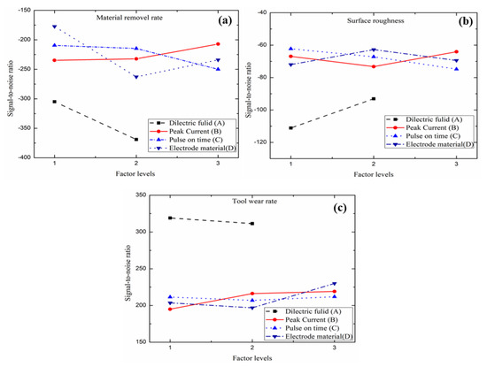 Pareto ANOVA presents the results in terms of sum at factor levels, percent contribution, and optimal levels corresponding to response (i.e., MRR) are presented in Table 8. The graphical representation (Figure 4a) shows that among the other electrode materials, graphite (electrode material: level 1) yields highest MRR. This is due the fact that graphite has greater thermal conductivity, density, and hardness values compared to brass and copper, and resulted in the highest spark during the EDM machining of HcHcr tool steel [63]. Peak current trends show negligible impact (i.e., 7.04% contribution) compared to the rest of the variables (see percent contribution in Table 8). MRR increases with peak current after crossing the mid-values of their respective levels shown in Figure 4a. This occurs due to high peak current producing the maximum amount of spark discharge energy coupled with higher impulse force in the spark gap, which tends to heat the workpiece, which causes melting and vaporization that results in high MRR. An increase in pulse-on-time proportionately increases the spark or thermal energy amount of heat transfer to the workpiece increases which causes the melting of material results in higher MRR. However, MRR decreases after crossing mid-values of pulse-on time (i.e., 75 µs) are due to the reduced energy density in electrical discharge spots instantaneously after the discharge time, as a result, the plasma channel expands continuously with pulse-on-time. Similarly, distilled water provides better MRR compared to the kerosene due to the issue of thermal conductivities of dielectric that may result in higher cooling rate and more surface cracks [64]. Note that electrode material (57.54%) followed by dielectric fluid (20.74%) and pulse-on-time (14.78%) resulted in the highest percent contribution towards MRR. A1B3C1D1 is the optimal factor levels for higher MRR. The determined optimal levels are not the set of L18 experimental matrix of Table 8 but might occur due to the multi-factor nature among the possible combination (34 = levels factors) of 81 experiments. Confirmation experiments for the results of the optimal level in high material removal rate were found equal to 0.0624 g/min.